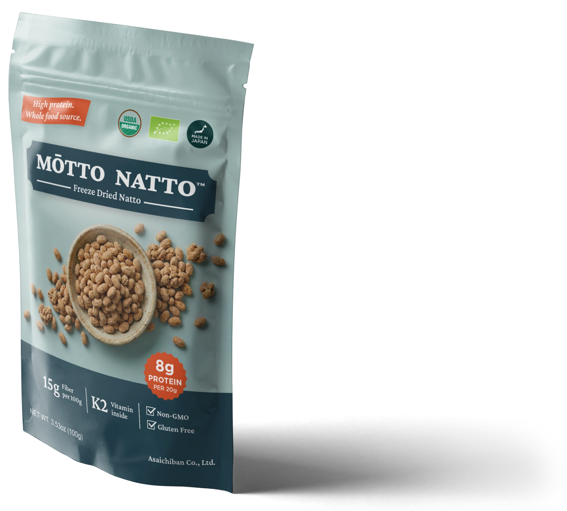 Each 20 g serving of Mōtto Natto™ packs 8 g of plant protein and a light, nutty crunch. It is freeze dried natto made from organic soybeans and B. subtilis natto , ready to sprinkle on almost anything.